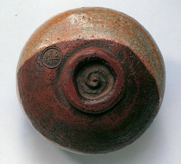 赤樂的胎是用赤土+熟料,釉藥是含長石成分透明釉,是的你沒看錯就是透明釉,赤樂之所以為紅色是因為胎的顏色而非釉的顏色。當然人會問「有些稽古用赤樂,他們露胎處是白屁股耶」這尷尬了,我也不知道,下次有遇到佐々木老師再請教他,但博物館的露胎赤樂(圖3)胎土確實是紅色的。胎先素燒,然後再上釉再入窯燒,窯溫800度上下。