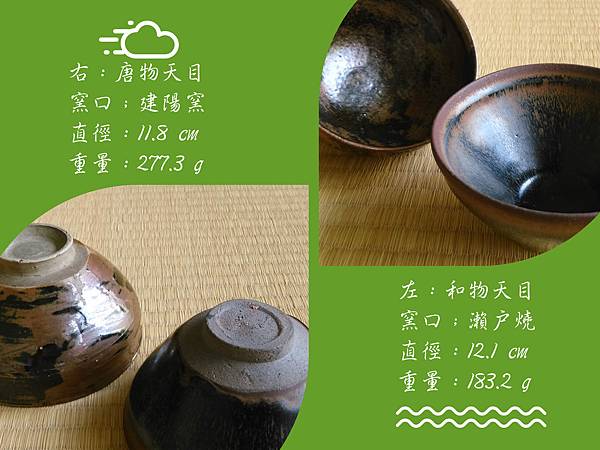 圖二是兩個大小相當的唐物及和物天目茶碗,大家可以比比看他們的重量,現代製品的天目茶碗也是非常輕的,大家可以回去秤秤自己天目茶碗的重量比較一下。