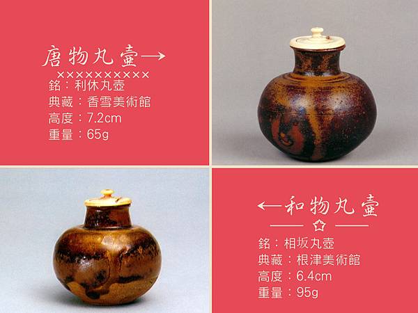 圖一是兩個大小相當的唐物及和物茶入,大家可以比比看他們的重量,現代製品的唐物寫茶入也是非常重的,大家可以回去秤秤自己茶入的重量比較一下。